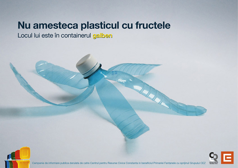 Don’t mix plastic and fruit. It belongs in the yellow container.